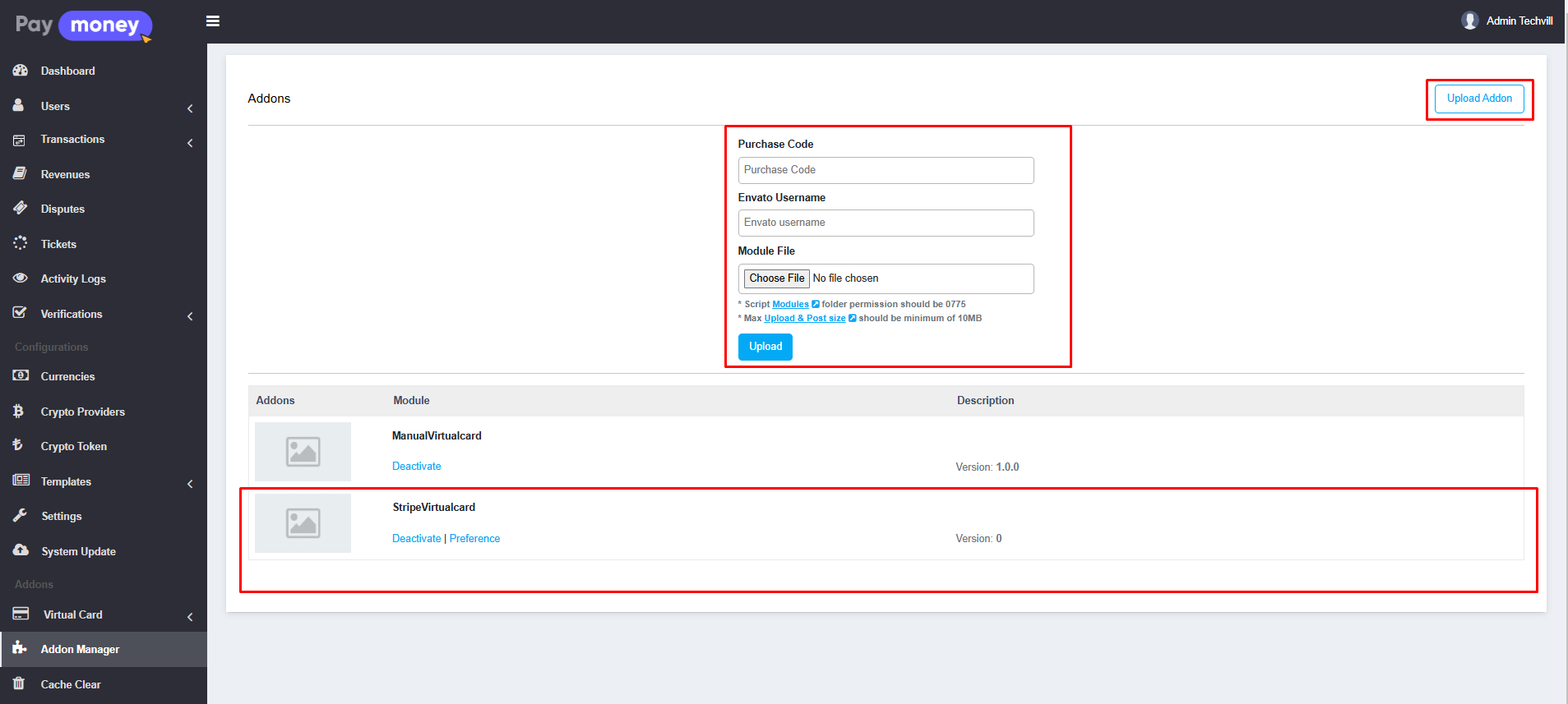 To setup Automated virtual card provider. First of all, Navigate to Addon Manager to install the addon in Paymoney System.