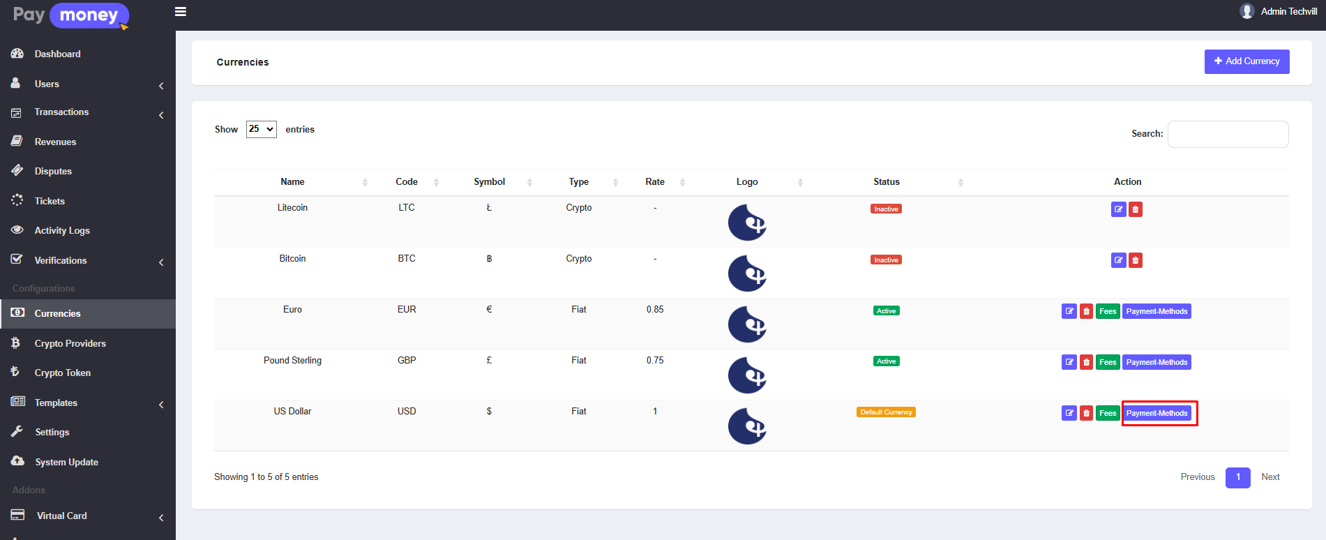 After that, navigate to Currencies menu from sidebar. Click on the Payment-Methods button of your preferred currency.