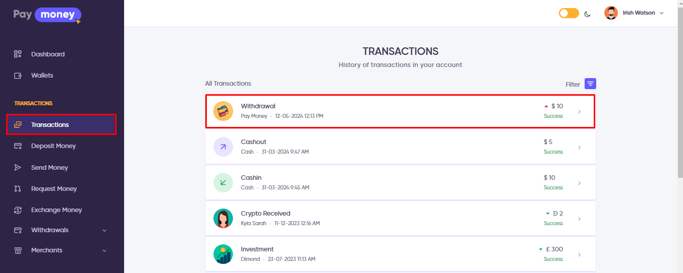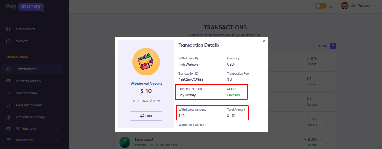 After successfully withdraw amount from the user account the user can see the details of the withdraw from Transaction.