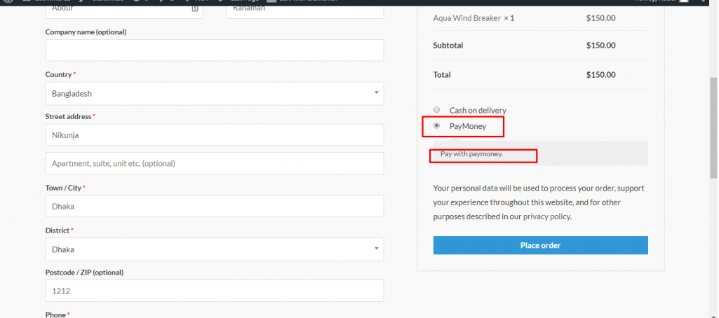 Step 5: While checkout from the woo-commerce site make sure that payment method is Paymoney.