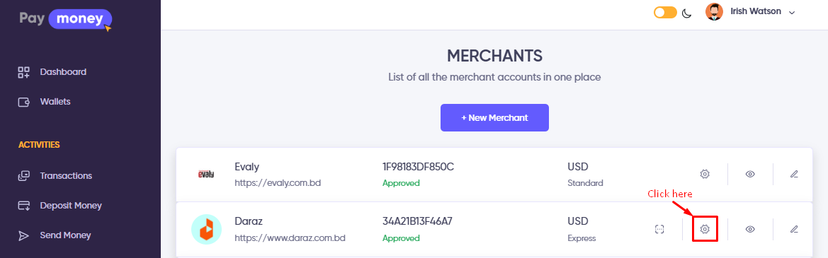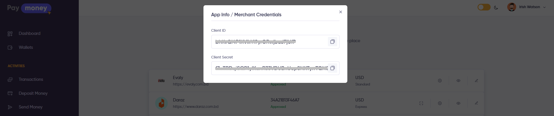 To get the client id and secret key open the paymoney.techvill.org (Your site) in another browser (This is important). And, logged in as a merchant and navigate to merchants.