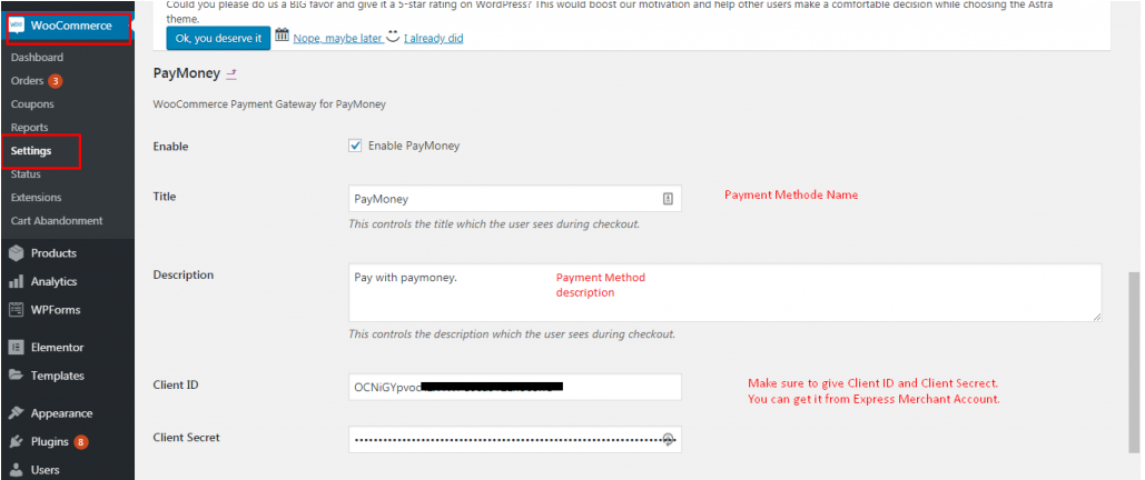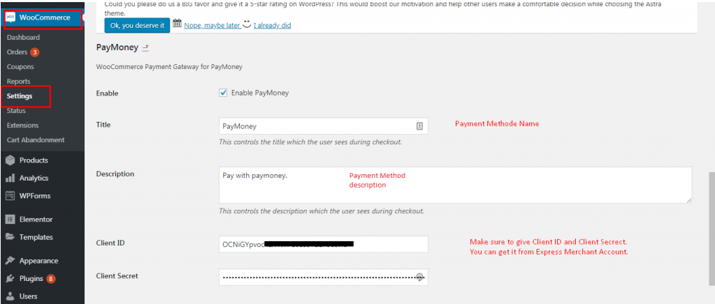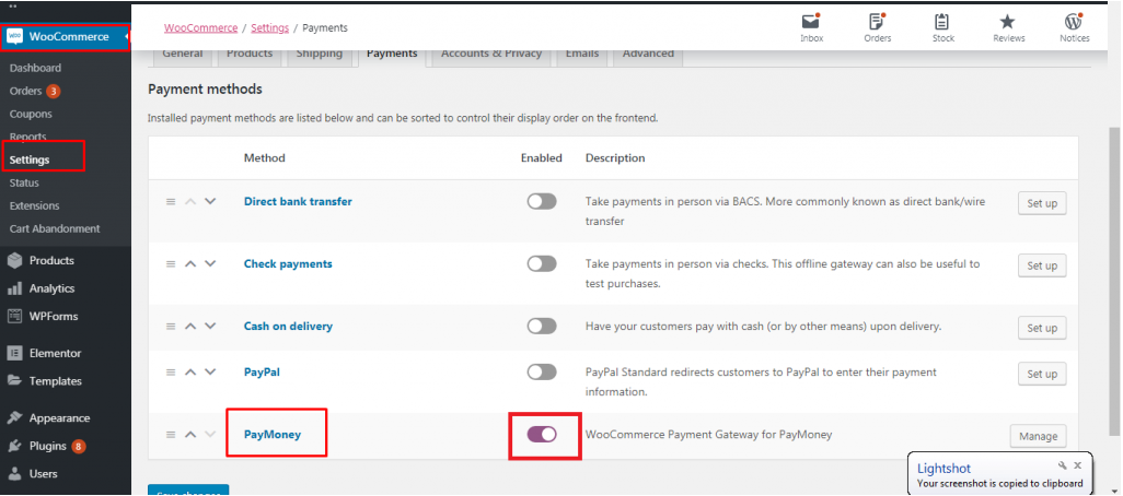 Step 2: Then, Go to the Woo-Commerce Setting and then Payment Method and enable the plugin.